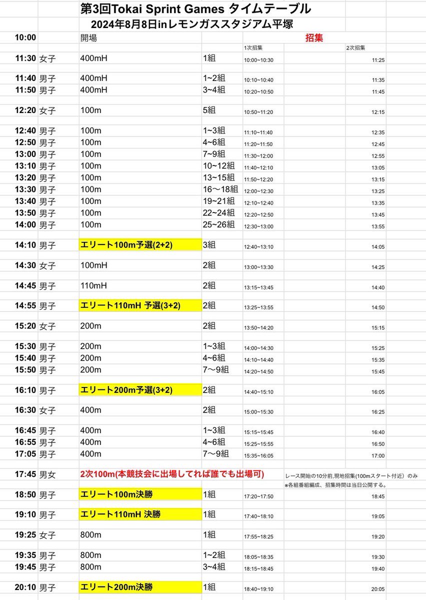 【第3回TokaiSprintGames】タイムテーブルが確定致しました。添付しました写真をご参照下さい。また、スタートリストも確定致しました。以下のリンクからご確認くださいhttps://drive..