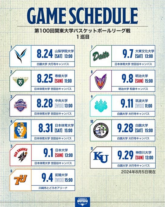 【試合情報(Aチーム)】「第100回関東大学バスケットボールリーグ戦」の試合日程(1巡目)が発表されました。https://kcbbf.jp/news/detail/id/724…応援よろしくお願いし..