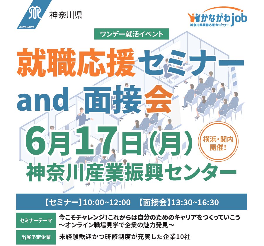 6/17(月)は、ワンデー就活イベント「就職応援セミナーand面接会」を神奈川産業振興センターで開催します!午前は、就活力・就職マインドがアップするセミナーとオンライン職場見学、午後は10社規模の面接..