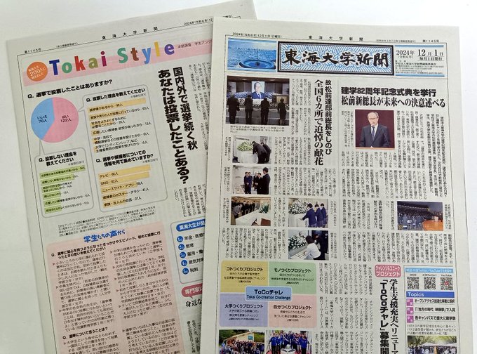 東海大学新聞12月号発行トップは「建学82周年記念式典」。故松前達郎前総長をしのぶ追悼の献花も全国6カ所で行われました。他にも、吹奏楽研究会が全日本で金賞プロ球界に進む3選手の声女子サッカー部が関東リ..