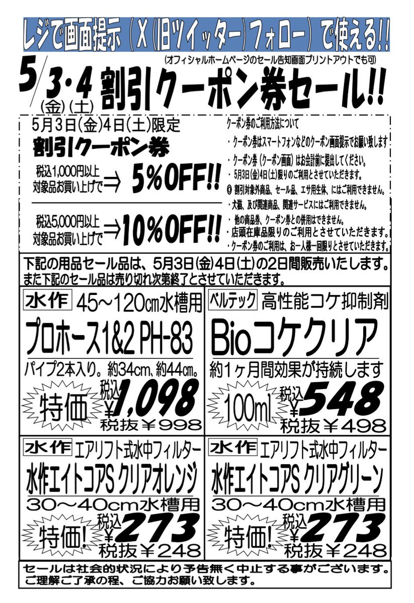 ゴールデンウィークのSALE情報になります。GWはずっと割引クーポンでかなり🉐に買い物が出来ます。是非ご利用ください!!お会計前にご提示をお願いします🙇004