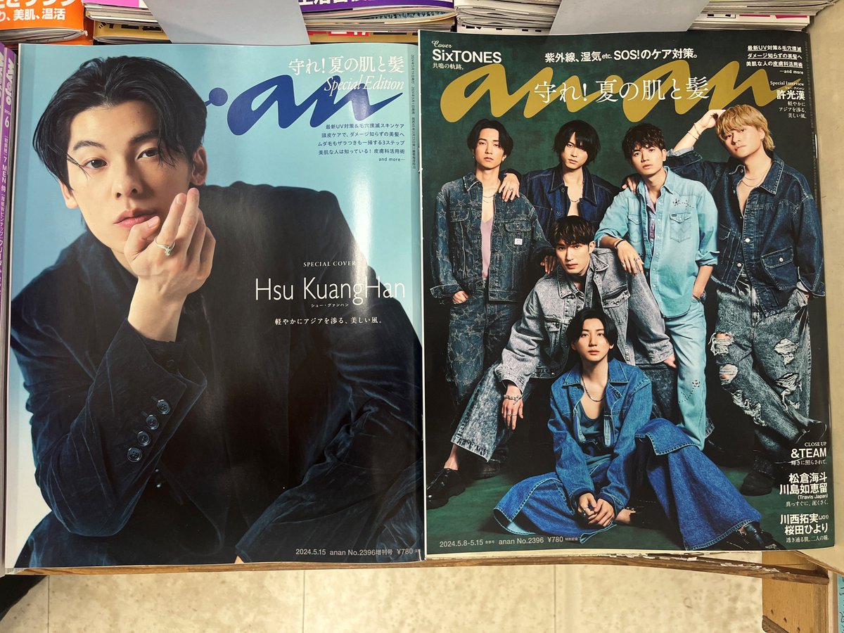 【全店】雑誌anan本日発売特集は「守れ!夏の肌と髪」です。SixTONESが表紙の通常版とHsuKuangHanさんが表紙の増刊号発売!001