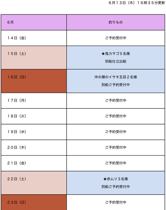 直近1週間の出船予定、予定表は日に一度程度しか書き換えできません、予定は刻々と変わりますので、詳しくは予約ページをご覧ください、ご予約お待ちしておりますhttps://eian.jp/yoyaku/
