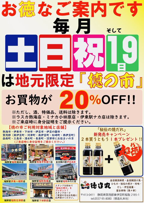 地元限定『徳の市』#2割引フェア毎週土日・祭日・毎月19日お買物が20%OFF好評開催中です秘伝の煮汁・おだし各種・魚惣菜・いか三升漬・ひもの・ところてん各種取扱。試食を豊富にご用意して、皆様のお越し..