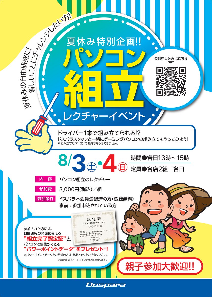 ゲーム好き必見ドスパラ小田原店にて誰でも簡単にゲーミングPCを組み立てられるレクチャーイベントを開催!家族で一緒に、ゲーミングPCを組み立ててみよう!ドライバー1本で組み立てられるので、初心者でも安心..