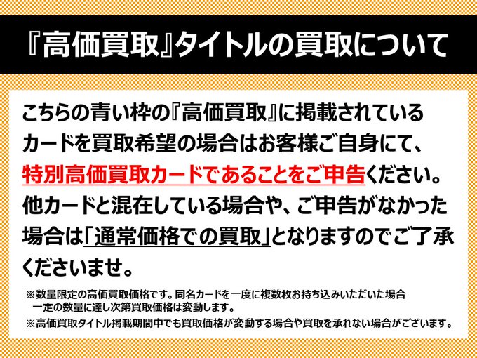 【トレカ高価買取情報】7/24(水)~7/30(火)の高価買取情報です!!#ポケカ"青い枠の『高価買取』掲載タイトルに関しまして"添付の注意事項をご確認いただき、事前にお客様より申告をお願い致します。..