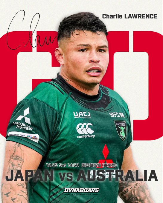 ラグビー日本代表 試合登録メンバー発表 リポビタンDチャレンジカップ2025 日本代表 オーストラリア代表 10月25日(土) 14:50 キックオフ 東京・国立競技場 三菱重工相模原ダイナボアーズからは、チャーリー・ローレンス選手が選出されました 頑張れチャーリー