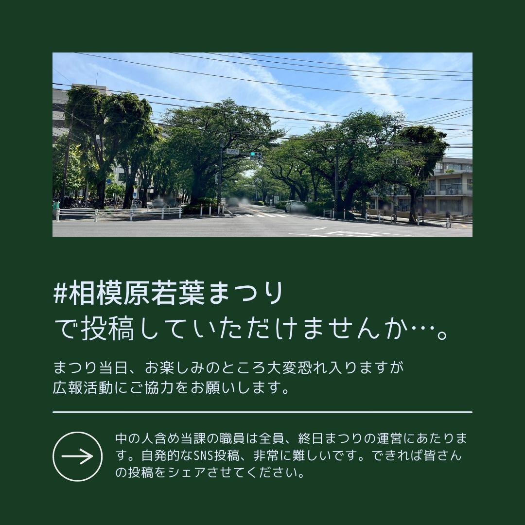 【ご協力のお願い】当日の盛り上がりを投稿したくて課内で色々と検討したのですが、まつり本体の運営に精一杯で非常に難しいという結論が出ました。お力添えいただける方は#相模原若葉まつりで投稿していただけると..