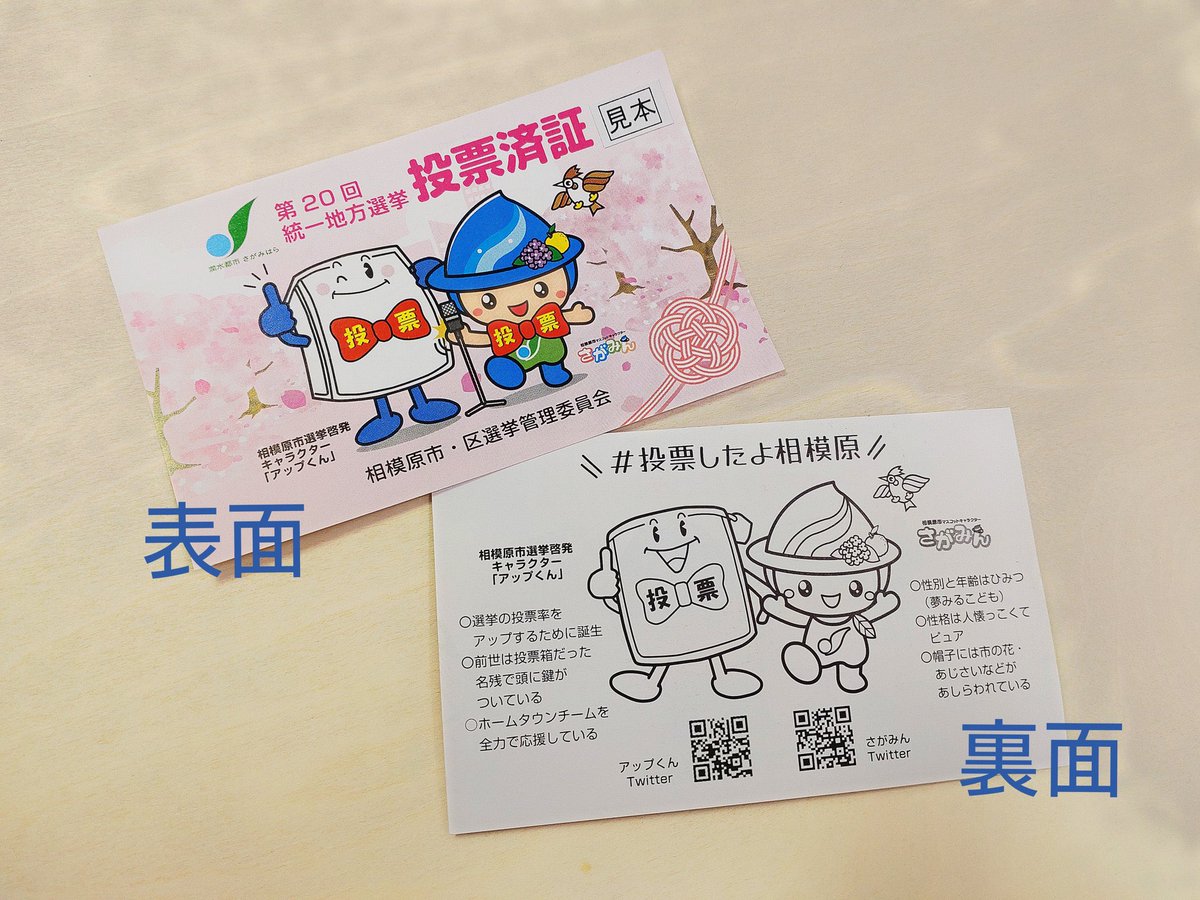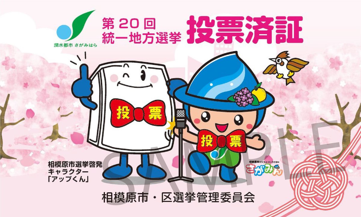 満開の桜に囲まれて、スタンドマイクの前でポーズを決めるさがみんとアップくん。お揃いの蝶ネクタイでとっても仲良し。奥に都市、右下に津久井の組紐をイメージしたあしらいを配置しました。明日は#統一地方選挙。..