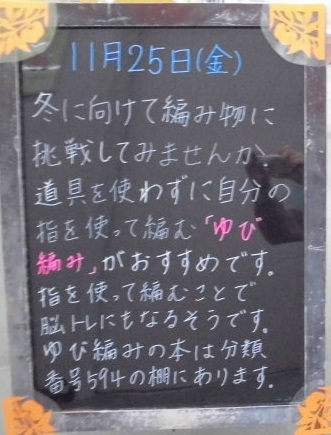 【#今日のウェルカムボード】気軽に始められそうな「ゆび編み」🧶この冬チャレンジしてみたいです🌟本日もご来館をお待ちしております!#相模大野図書館#ゆび編み004