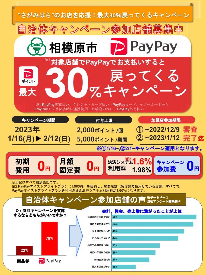 【相模原市×PayPay】令和5年1月からのポイントキャンペーン参加店舗募集中!※すでに中小企業のPayPay加盟店の場合は、申請不要でキャンペーン対象となります。#相模原市 #PayPay #戻って..