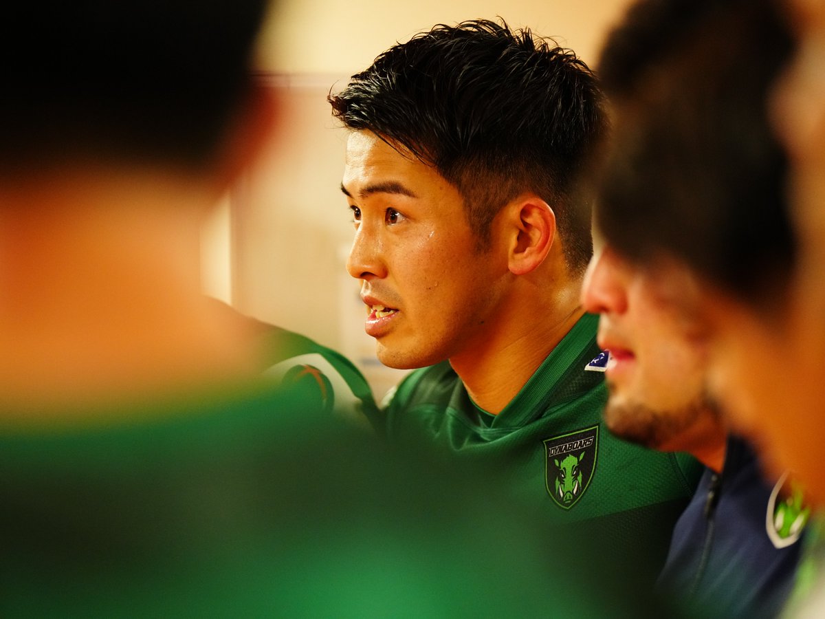 試合後、記者会見に向かうキャプテン岩村昂太。過剰な喜びはなく、今にも倒れそうにゆっくり歩く。「勝ったよ。本当に僕たちだけの力じゃないね。このチームは。スタジアムを緑に染めてくれて、いっぱいいっぱい応援..