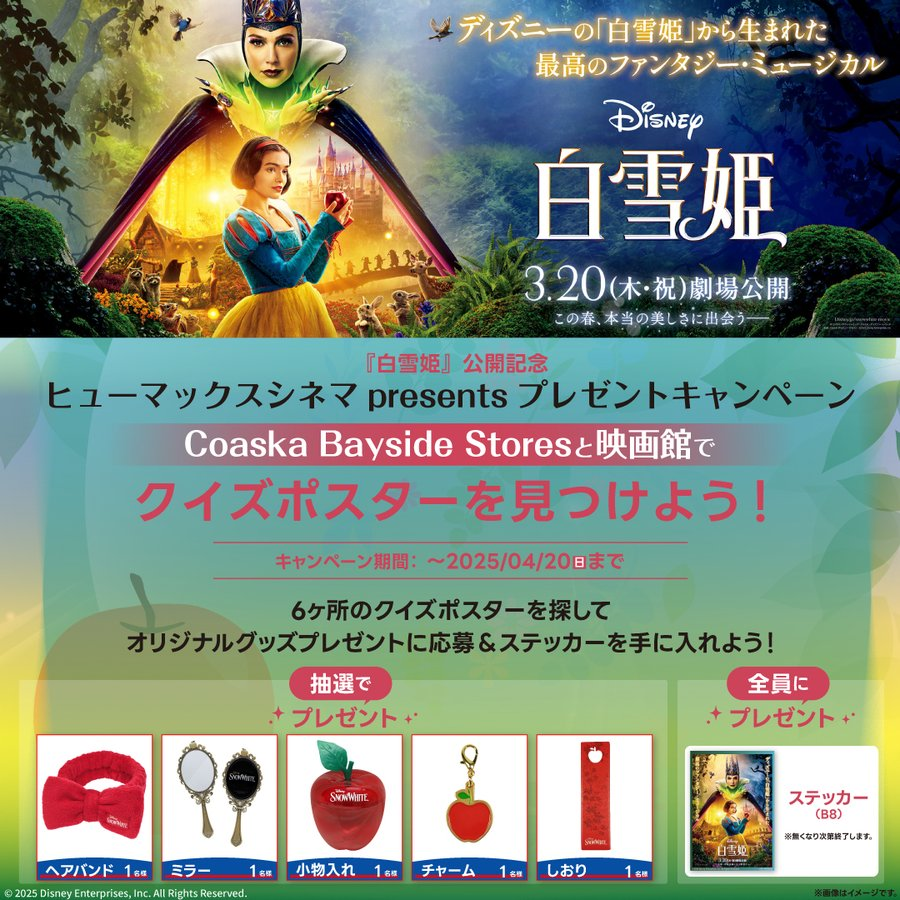#白雪姫公開記念施設内6か所にあるポスターを探して、クイズに答えようクイズラリーはご参加いただいた方全員にステッカーをプレゼントさらに抽選でオリジナルグッズが当たるチャンス!応募用紙は劇場で配布中詳細..