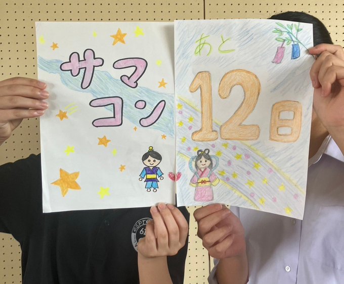 8/8 サマコンまであと12日! 今日のカウントダウンは2年Hrnパートのすずーぴーと、1年Hrnパートのうらばんです! 織姫と彦星を共同で描いてくれました! ロマンチックでいいですね サマコンではHrnコンビの素敵な音色にご注目ください!