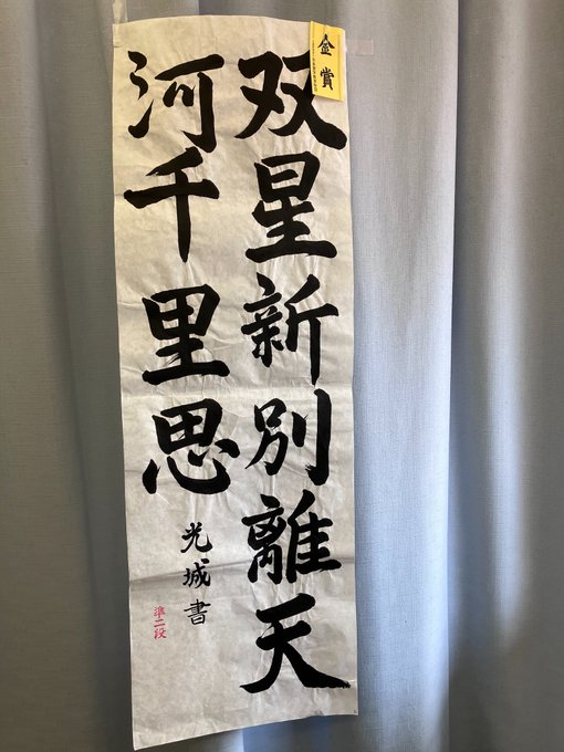 初段になって、1年が過ぎた七夕作品で、準二段に昇段。初めて金賞も頂け、次は観峰賞をと思いつつも、欲を出さず、書を楽しむようにと心掛けます。二段になれば中学生を教える師範の免状がもらえるので、次の目標で..