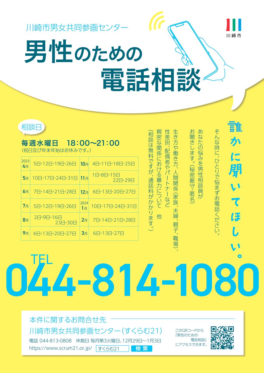 すくらむ21では男性のための電話相談を実施しています。相談日は毎週水曜日18時~21時です。男性相談員がお聞きします。#電話相談 #男性相談 #悩み相談 #川崎市 #職場 #家庭 #ストレス000