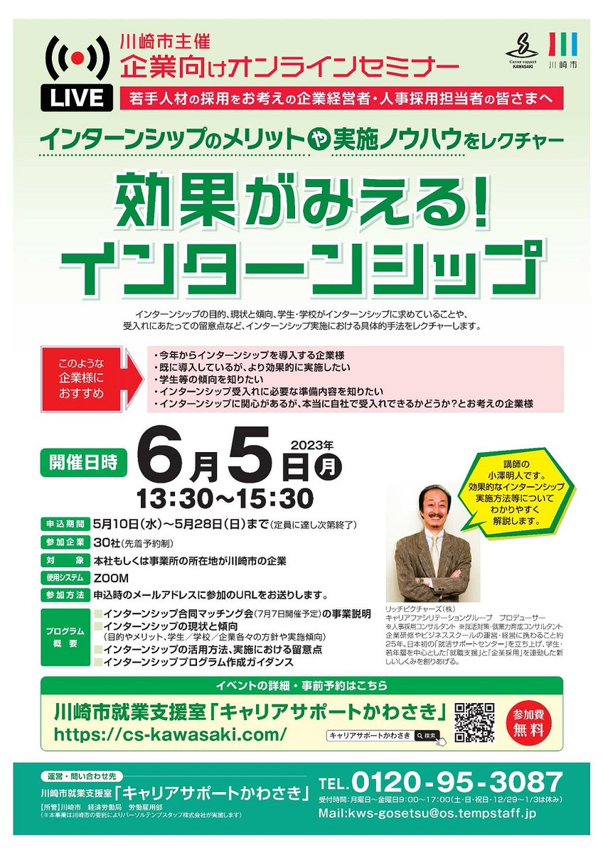 【企業向け】「インターンシップ受入セミナー」を6月5日(月)にオンラインで開催!(無料)インターンシップ導入のメリットや実施のノウハウをレクチャーします!ぜひご参加ください。cs-kawasaki.c..