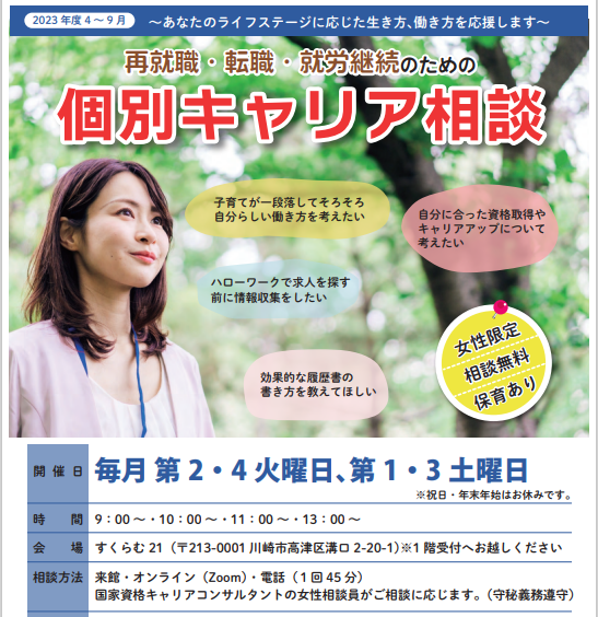 すくらむ21では女性のための個別キャリア相談を実施しています。5月23日(火)、6月13日(火)、6月17日(土)、6月27日(火)ご予約可能です!(相談方法は、来館・オンライン・電話/保育あり)お申..