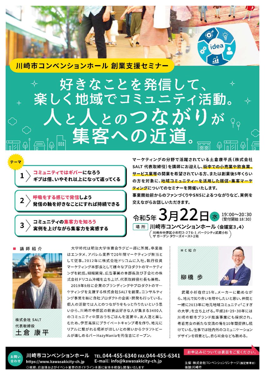 【川崎市コンベンションホール主催 創業支援セミナー 3/22(水)】店舗経営検討中・創業間もない方必聴。バー経営者でもある #マーケティング のプロが地域コミュニティを活用した販促・集客マーケティングを伝授。先着20名・無料。 #創業