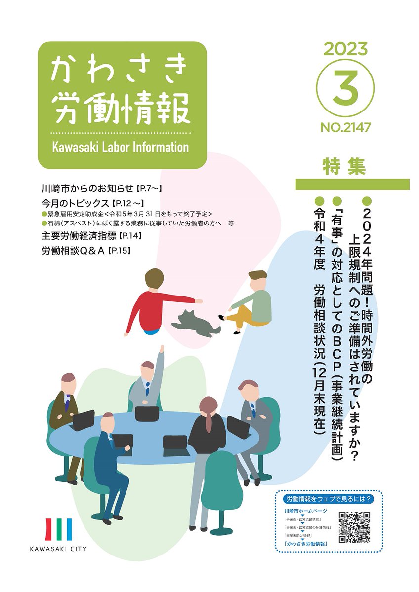 #かわさき労働情報(令和5年3月号)を発行しました!以下の内容を掲載していますので、ご覧ください。<令和5年3月号(No.2147)>●2024年問題!時間外労働の上限規制へのご準備はされていますか?..