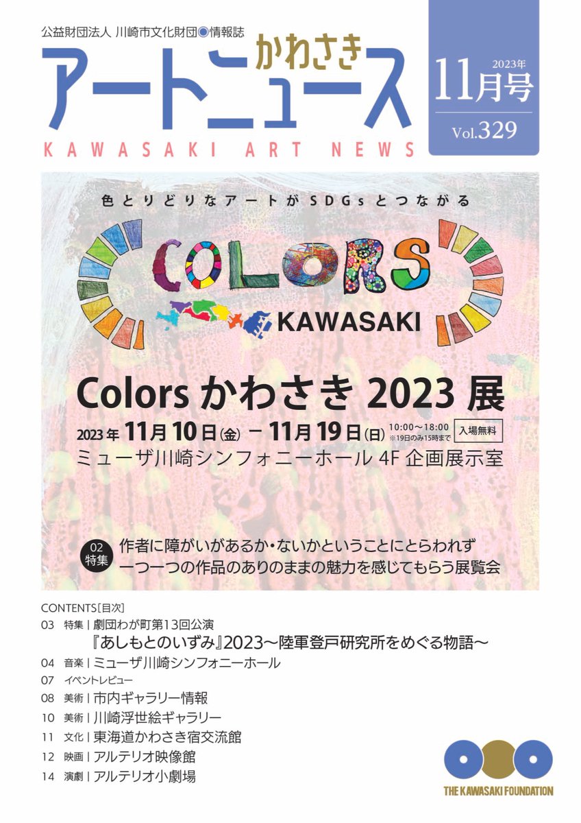 【WEB版公開】かわさきアートニュース11月号WEB版を公開しました📖市内の文化情報などを掲載した当財団発行の情報誌。11月号は「Colorsかわさき2023展」「劇団わが町第13回公演『あしもとのい..