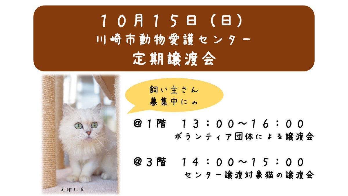【イベント情報】10月からコロナ禍により中止していました、毎月第3日曜日のセンター定期譲渡会を再開します!(^▽^)/3階はセンターに収容されている猫たち、1階はボランティア団体が保護している動物たち..