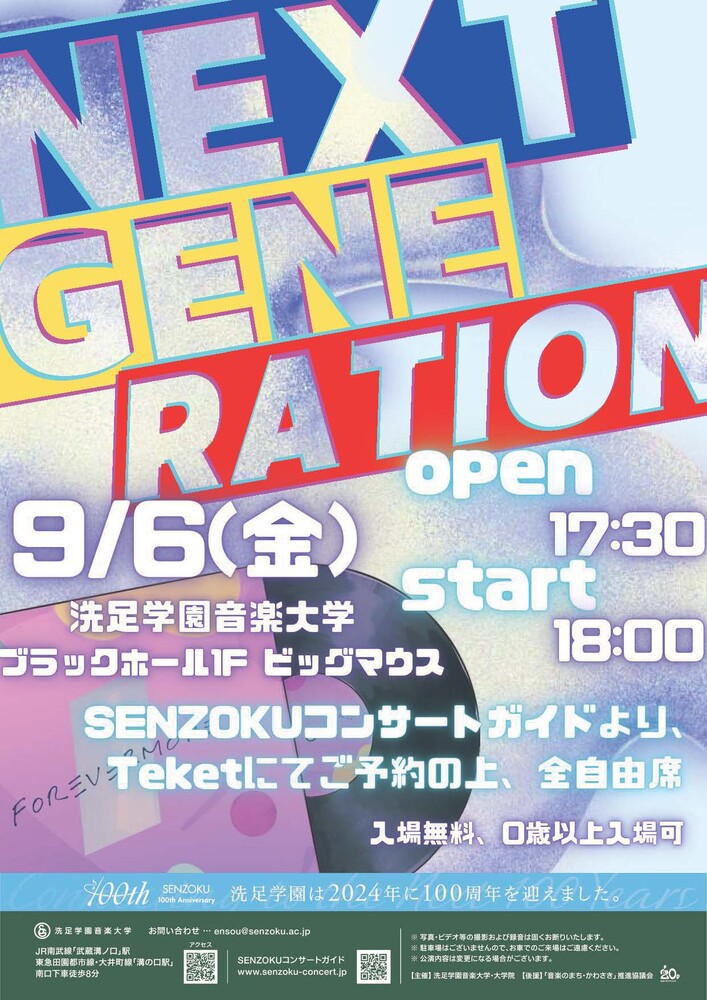 【演奏会情報】『Next Generation』 ◆9月6日(金) ◆18:00開演(17:30開場) ◆ビッグマウス ◆無料 ◆0 歳以上入場可 詳細はこちら https://senzoku-concert.jp/concert/3101/