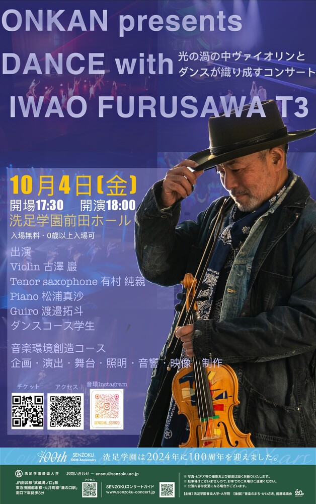【演奏会情報】『ONKANpresentsDANCEwithIWAOFURUSAWAT3』◆10月4日(金)◆18:00開演(17:30開場)◆前田ホール◆無料◆0歳以上入場可詳細はこちらhttps:..