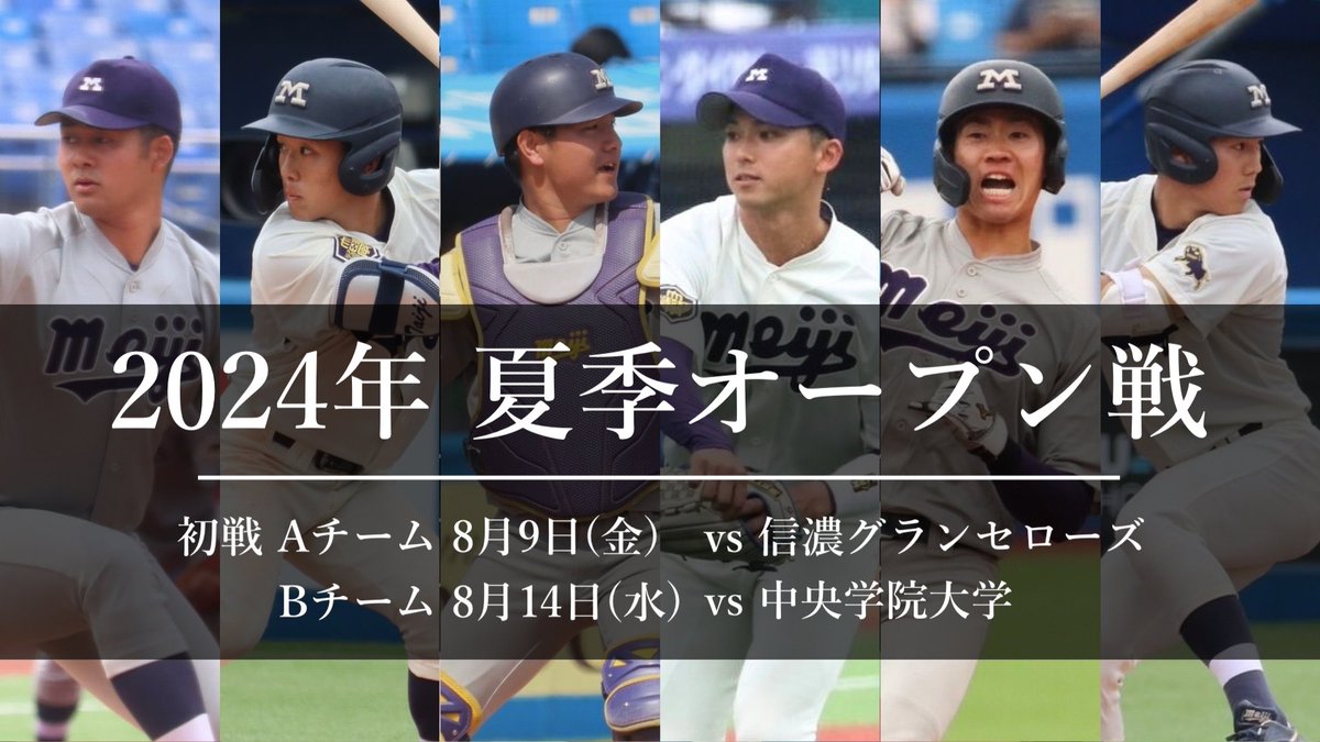 【2024年夏季オープン戦】2024年夏季オープン戦の日程を公開しました。リーグ戦優勝に向け、チーム一丸となって精進してまいります!応援よろしくお願いします!▷詳細はこちらhttp://meiji-b..