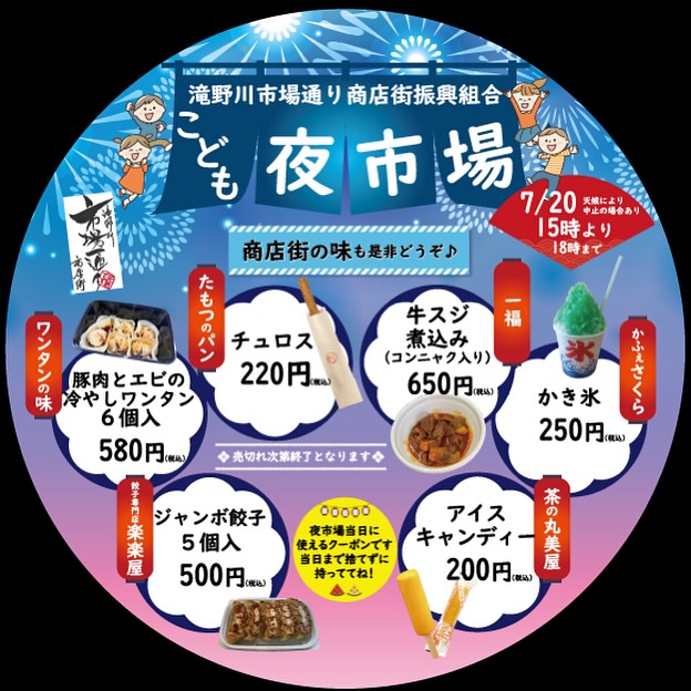 滝野川市場通り商店街夜市場開催🎉7/20(日)15時より18時まで天候により中止の場合あり☔️商店街グルメや🍴🎈スーパーボールすくい🎈カタヌキ🎈ヨーヨーつり🎈めだかすくい🎈移動動物園など、お楽しみコー..