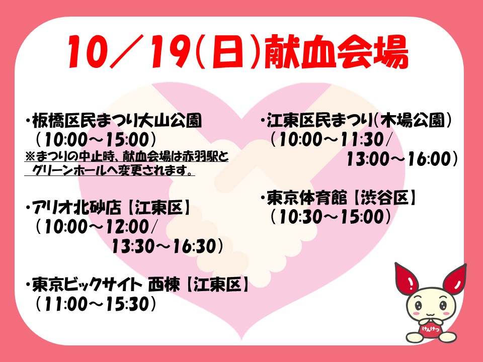 献血会場のお知らせ 明日も多くの会場で献血実施予定です ラブラッドでのご予約は三時間前まで可能です 日曜日もご協力をお待ちしております!!! https://bs.jrc.or.jp/ktks/tokyo/place/m1_03_kenbus.html… #献血 #板橋区 #江東区 #渋谷区