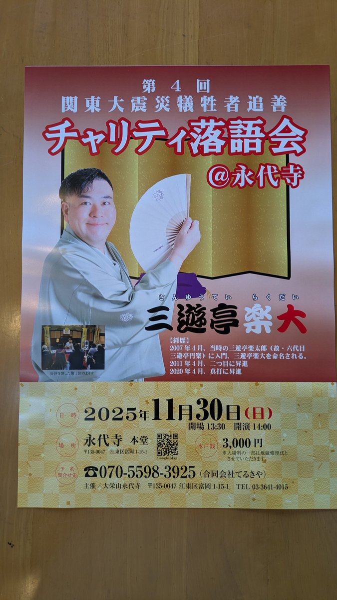 11/30(日) ご案内 #チャリティー落語会 毎回大人気、お寺の本堂で #三遊亭楽大 師匠..