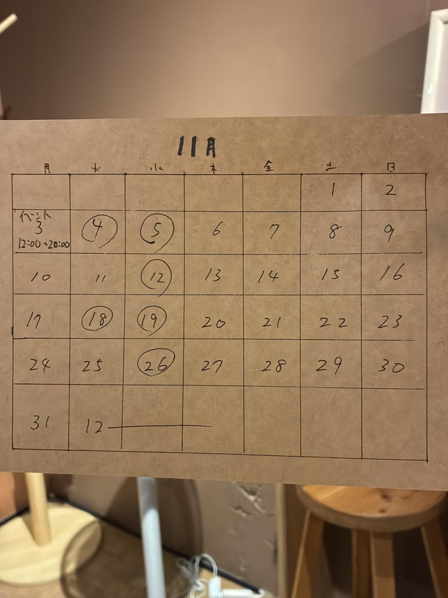 11月の予定になります。毎週水曜日の他に4.18日火曜お休み頂きます3日はご近所さん同士でイベントやりま..
