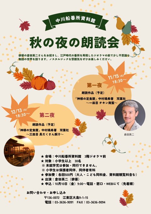 【申込受付中イベント】秋の夜の朗読会第一夜11/15(土)18:30~第二夜12/13(土)18:30~中村颯希著『神様の定食屋』を俳優の倉田英二さんに、中川番所ジオラマ前で読んでいただきます※1日の..
