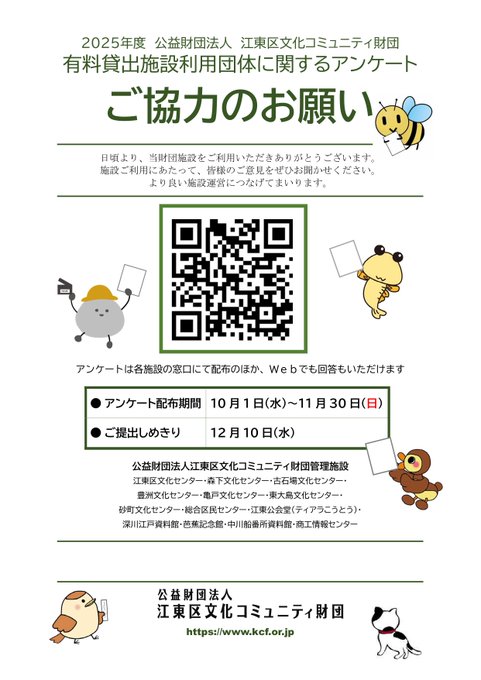 <有料貸出施設をご利用のお客様へ>施設利用に関するご意見をぜひお聞かせください。より良い施設運営につなげてまいります。※団体でご利用の方は、団体のご意見として回答をお願いします。回答はこち..