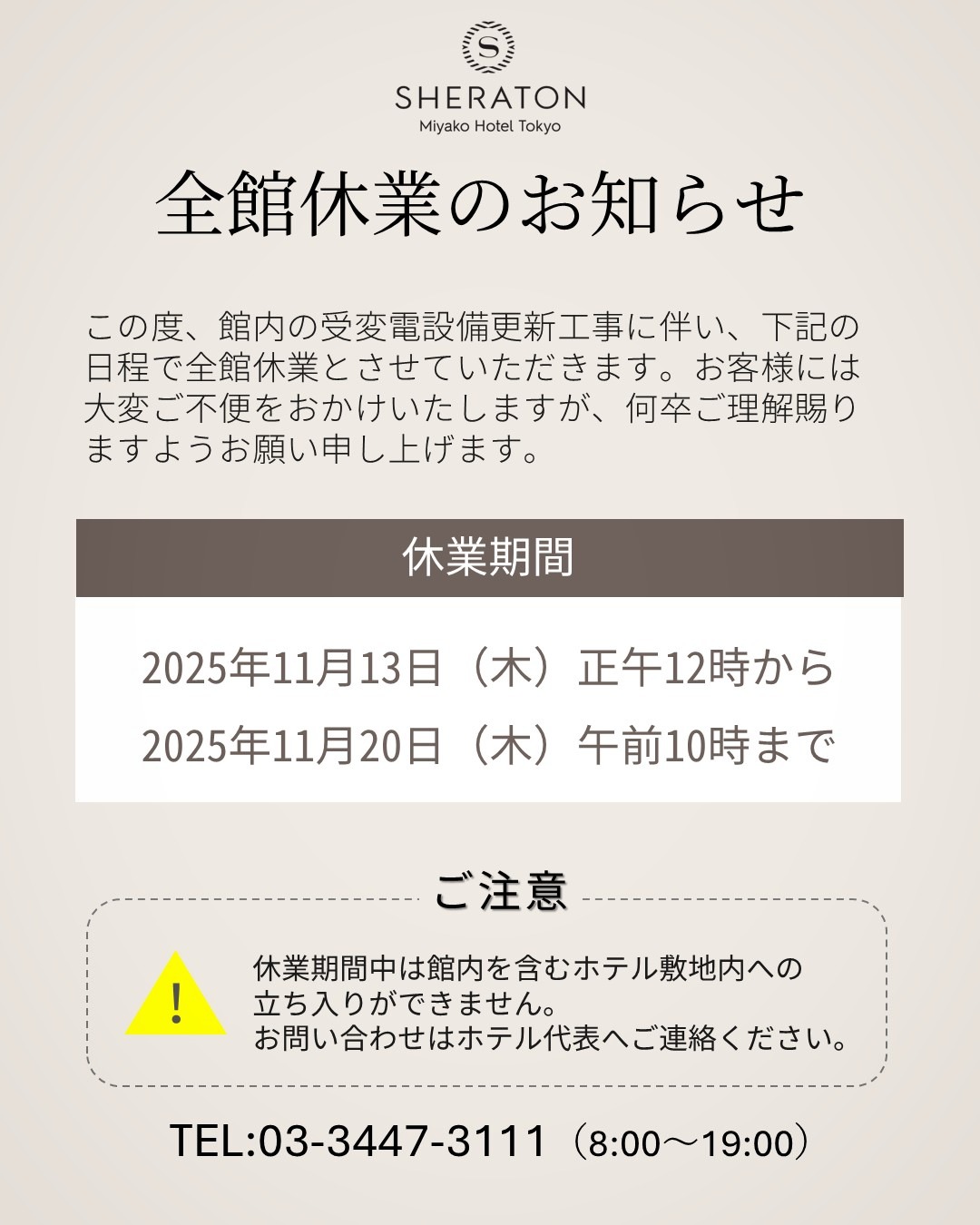 平素よりシェラトン都ホテル東京をご愛顧賜り厚く御礼申し上げます。この度、館内の受変電設備更新工事に伴い、下記の日程で全館休業とさせていただきます。お客様には大変ご不便をおかけいたしますが、何卒ご理解賜りますようお願い申し上げます。