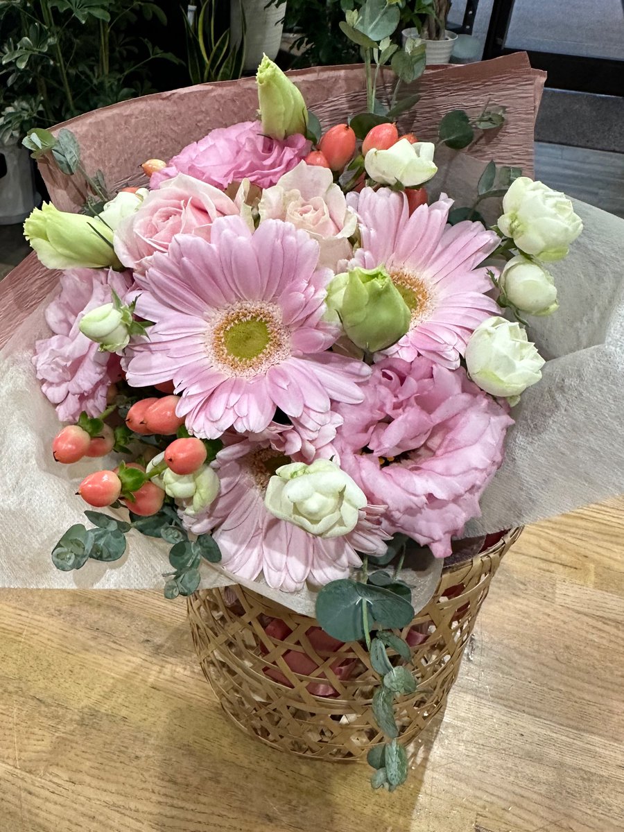 今日の1枚取引先の担当者の方へ退職用途で、優しく淡い色合いでのご依頼です。ガーベラを中心にまとめてご用意致しましたご注文は電話、FAX、メール、ホームページのECショップ、BASEよりお承りしておりま..