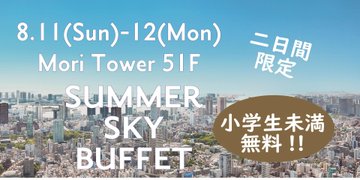 8月11日(日・祝)、8月12日(月・休)森タワー51Fにて、「SUMMERSKYBUFFET」を開催!お子様から大人までお楽しみいただけるお料理の数々をブッフェスタイルでご用意します。森美術館や展望..