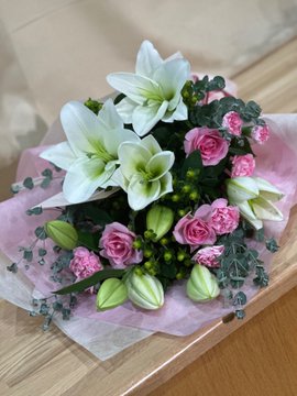 今日の1枚18回目の結婚記念日に花束のご依頼。奥様の大好きな白いユリにピンク色の花を入れてお任せでオーダー帰宅途中に花束を直ぐにピックアップドライブスルーのように。#港区#麻布台ヒルズ#東京ガーデン#..