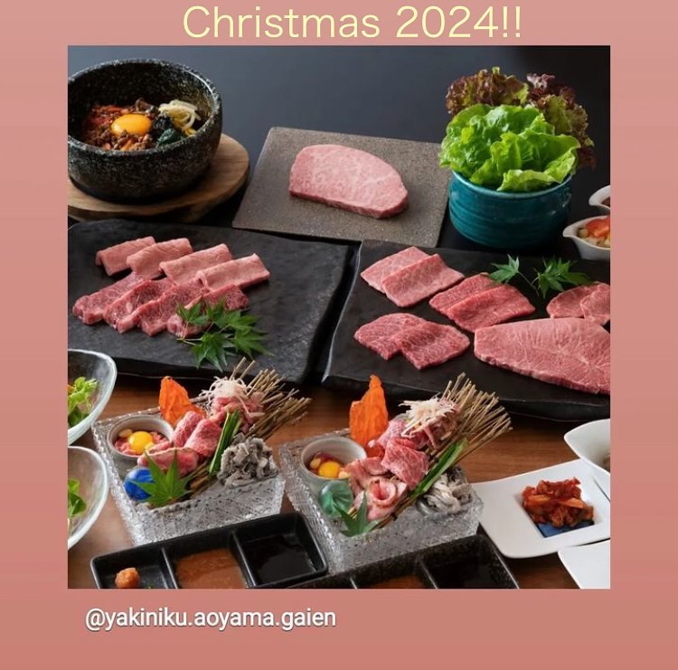 焼肉青山外苑2024年クリスマス🎄メニューのご案内¥15000/お一人様(税込)【前菜】●初菜3種盛合せ(自家製キムチ・彩ナムル・牛タン塩ゆで山添え)●青山外苑サラダ●黒毛和牛刺身3種盛合せ(和牛刺し..
