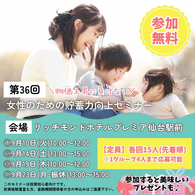 /貯蓄一択から一歩先へ女性のための貯蓄力向上セミナー開催\資産運用のやり方NISAやiDeCoの有効性などの疑問にお答えリッチモンドホテルプレミア仙台駅前知識がない方でも簡単にお金の基本がマスターでき..