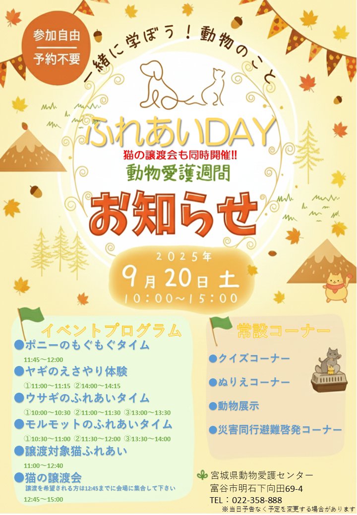 毎年9月20日から26日は【動物愛護週間】です宮城県動物愛護センターでは9月20日(土)10時から【ふれあいDAY】を開催します! 猫の譲渡会も同時開催 是非ご参加ください #イベント #譲渡会 #拡散希望 #犬 #猫 #動物愛護週間