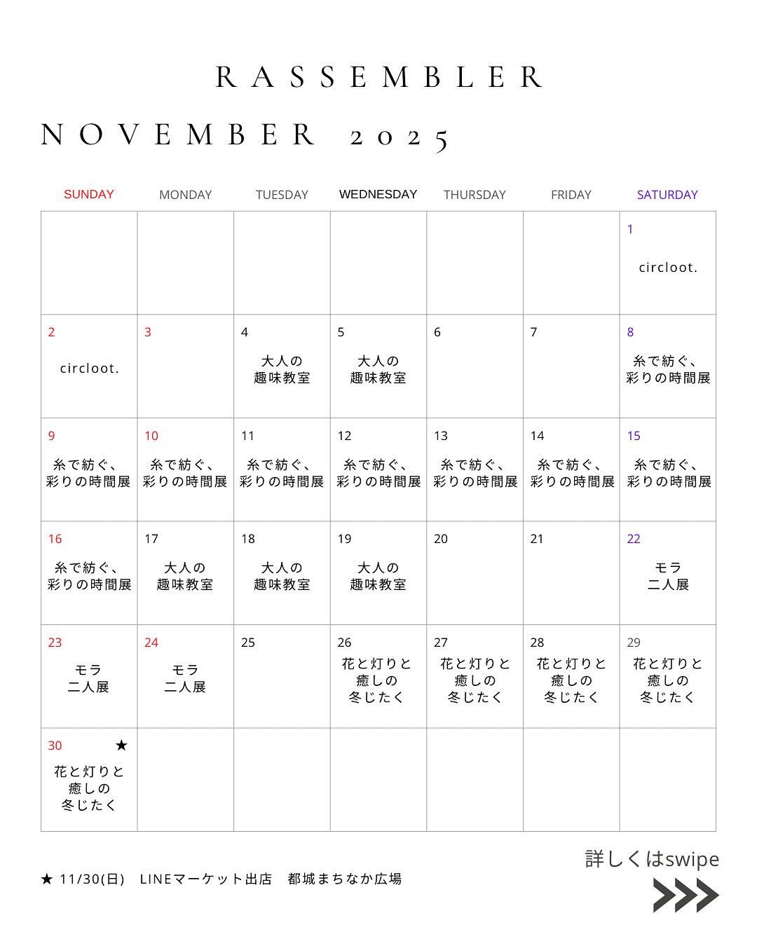 November🍁𓂃𓈒𓏸rassembler_2025年11月のスケジュールですイベントの詳細はInstagram、公式LINEからご覧いただけます︎︎︎︎☑︎...︎⬚︎今後のイベント⬚︎rass..