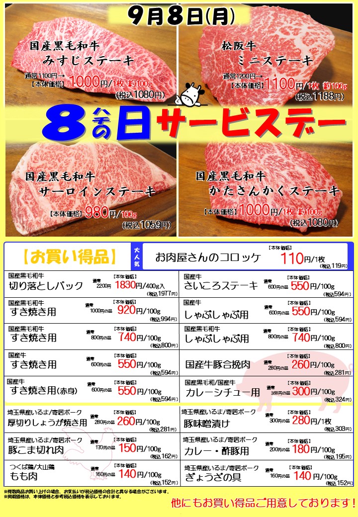【ミートプラザニシジマ】8の日サービスデー!https://n-meat.co.jp/archives/35048明日8日(月)に「8の日サービスデー」を開催致しますお買い得品を多数ご用意!皆様のご来..