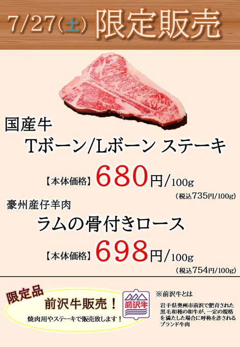 【ミートプラザニシジマ】限定販売https://n-meat.co.jp/archives/42832明日27日(土)に限定品のTボーンステーキ、ラム肉を販売致しますまた、前沢牛を限定で販売予定です皆..
