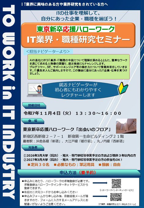 就活セミナーのお知らせ 11月4日(火)に大学3、4年生等を対象とした「IT業界研究セミナー」を開催します! 申込はこちらから https://jsite.mhlw.go.jp/tokyo-hellowork/kyushokusha/tokyo_shinsotsu/event/1104.html… #就活生 #就活 #26卒 #26卒と繋がりたい #転職 #大学生 #27卒 #27卒と繋がりたい