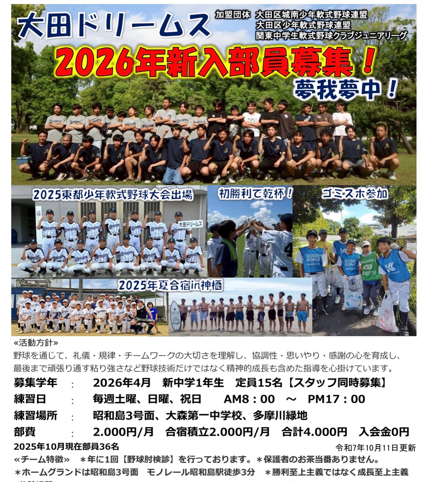 大田ドリームスは2026年の新1年生を募集しております。一気に秋の気配が漂う今日この頃。各地区まだ公式戦もあるかと思いますが、体験を募集しております。弊部3年生15名2年生12名1年生10名合計37名..