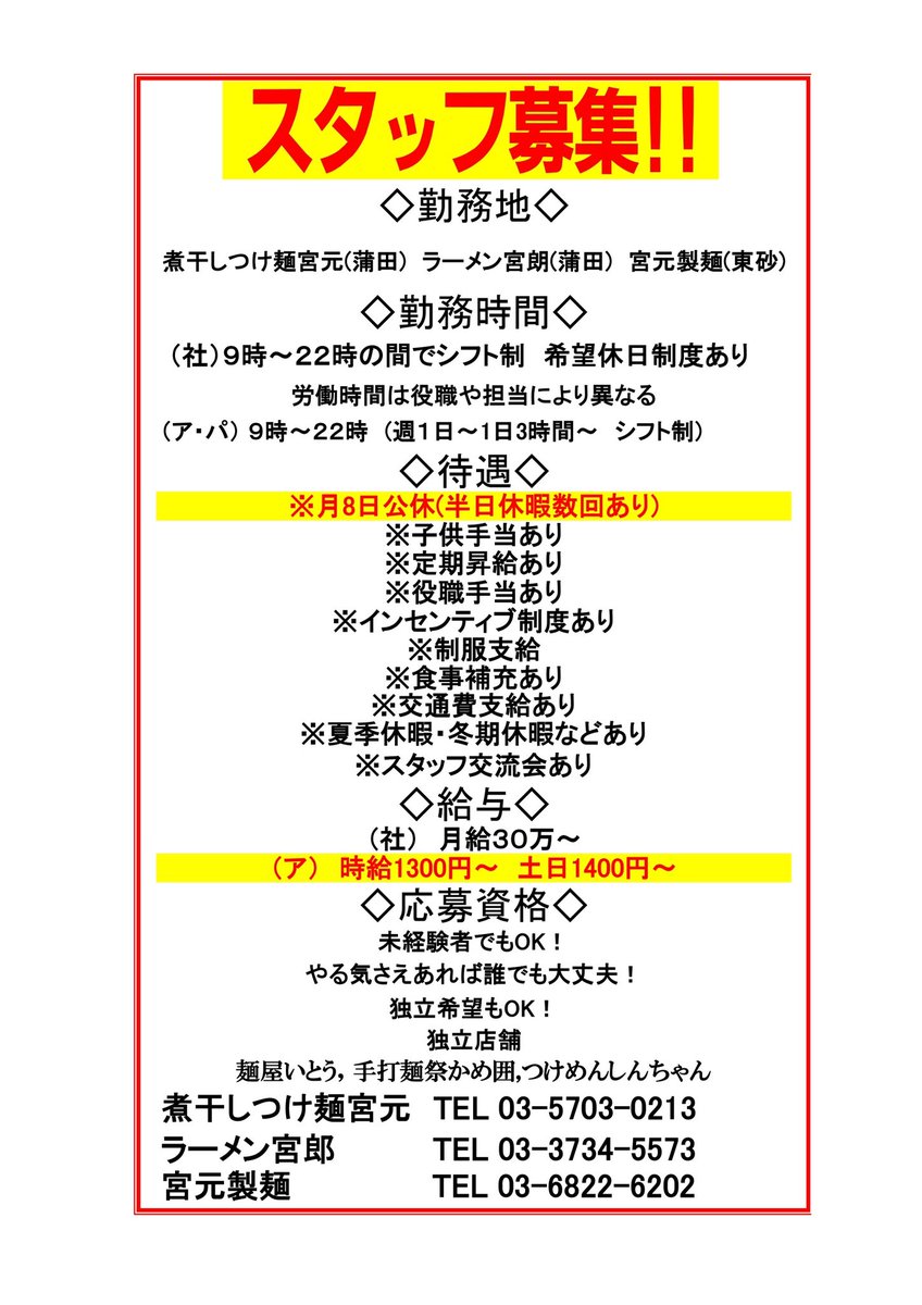 社員・アルバイト募集!ラーメンが好きなら誰でもOK!未経験でも構いません!誕生日や行事休みOK!賄い無料少しでも興味がある方DM・電話お待ちしております!社30万〜月8日〜ア1300円〜土日1400円..