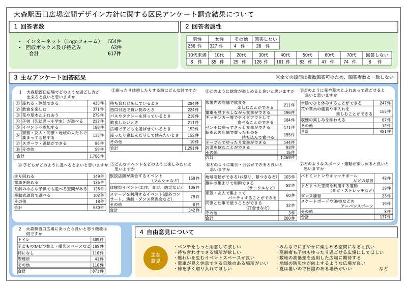 今回のアンケートは大森駅西口広場の使い方、広場でやってみたいこと、あった方が良い施設などの具体的な意見を伺うため、実施いたしました。