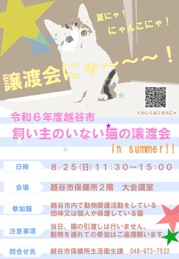 8月25日(日)、11:30~15:00に市保健所で飼い主のいない猫の譲渡会を開催します。費用は無料です。事前申込み不要、当日会場までお越しください。詳しくは市ホームページをご覧ください。https:..